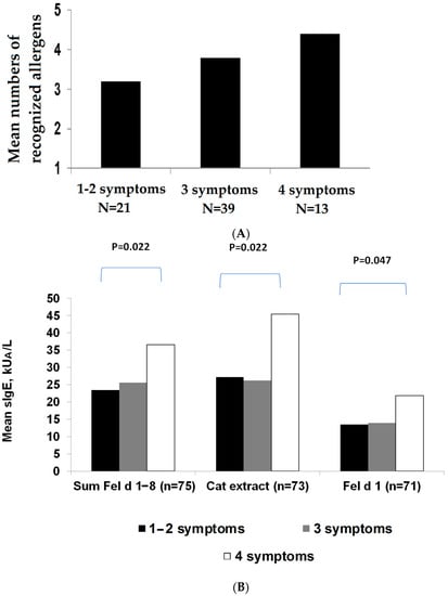 (A) Mean numbers of recognized allergens in patients suffering from 1–2, 3, or 4 cat-related allergic symptoms (asthma, rhinitis, conjunctivitis, and dermatitis); (B) mean levels of IgE (y-axis) specific to the sum of allergen molecules, the cat extract, and Fel d 1 (x-axis) in patients suffering from 1–2, 3, or 4 cat-related allergic symptoms (x-axis). Significant differences were calculated using the Mann–Whitney U test and are indicated for p ≤ 0.05 between the groups.