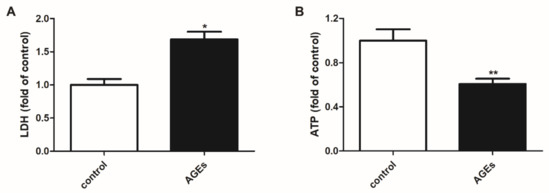 AGEs damaged cardiomyocytes. Cardiomyocytes were stimulated with AGEs (200 μg/mL) for 24 h. (A) LDH release into the culture medium was detected by LDH Cytotoxicity Assay Kit. (B) Cellular ATP level was detected by Cell Titer-Lumi™ Luminescent Cell Viability Assay Kit. Plots represent the mean ± SEM; n = 6. Statistical significance: * p < 0.05, ** p < 0.01 compared with control.