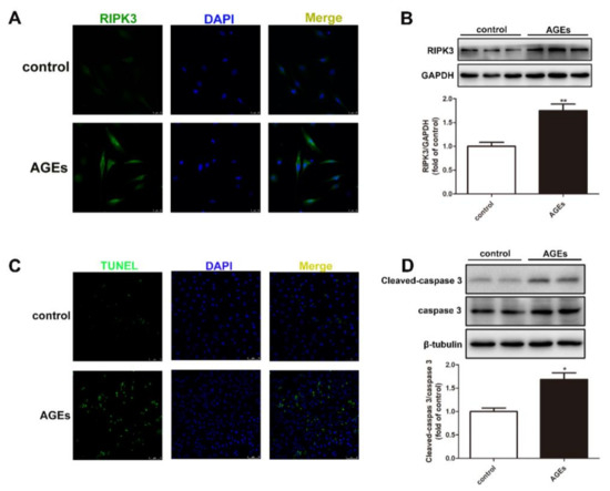 AGEs induced necroptosis in cardiomyocytes. Cardiomyocytes were stimulated with AGEs (200 μg/mL) for 24 h. (A) RIPK3 was immunofluorescence stained by Alexa Fluor 488 (Green)-conjugated IgG. The nuclei were stained by DAPI (Blue). Bar = 25 μm. (B) The expression of RIPK3 was detected by Western blot in cardiomyocytes. GAPDH was used as a loading control. (C) The apoptosis of cardiomyocytes was detected by One Step TUNEL Apoptosis Assay Kit. Bar = 75 μm. (D) The expression of caspase 3 and Cleaved-caspase 3 was detected by Western blot in cardiomyocytes. β-tubulin was used as a loading control. Plots represent the mean ± SEM; n = 6. Statistical significance: * p < 0.05, ** p < 0.01 compared with control.