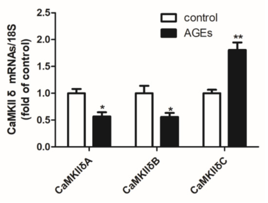 Since there is no specific antibody against CaMKII δ variants, quantitative real-time PCR was used to detect the gene expression of CaMKIIδA, CaMKIIδB, and CaMKIIδC mRNA in cardiomyocytes after stimulation with 200 μg/mL AGEs for 24 h. The study found that AGEs decreased the expression of CaMKII δA and CaMKII δB, but increased the expression of CaMKII δC in cardiomyocytes, suggesting CaMKIIδ alternative splicing was disordered after AGEs stimulation (Figure 3).