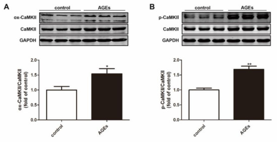 Previous studies have found that CaMKII can be activated through oxidation or phosphorylation. After AGEs stimulation for 24 h, the expression of ox-CaMKII and p-CaMKII were detected by Western blot. The results showed that AGEs increased the expression of ox-CaMKII and p-CaMKII (Figure 4).