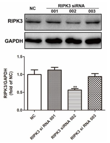 siRNA transfection downregulated RIPK3 expression in cardiomyocytes. Cardiomyocytes were transfected with NC siRNA or RIPK3 siRNA (001, 002, 003) for 4 h and cultured in DME/F-12 medium containing 10% FBS for 24 h. The expression of RIPK3 was detected by Western blot in cardiomyocytes. GAPDH was used as a loading control. Plots represent the mean ± SEM; n = 6. Statistical significance: ** p < 0.01 compared with NC.