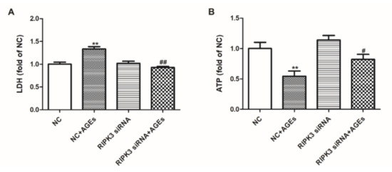 Downregulation of RIPK3 attenuated cell damage in cardiomyocytes. Cardiomyocytes were transfected with RIPK3 siRNA for 4 h followed by 200 μg/mL AGEs stimulation for 24 h. (A) LDH release into the culture medium was detected by LDH Cytotoxicity Assay Kit. (B) Cellular ATP level was detected by CellTiter-Lumi™ Luminescent Cell Viability Assay Kit. Plots represent the mean ± SEM; n = 6. Statistical significance: ** p < 0.01 compared with NC; # p < 0.05, ## p < 0.01 compared with NC+AGEs.