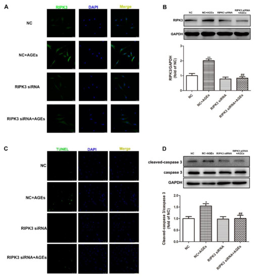 The cardiomyocytes were transfected with RIPK3 siRNA for 4 h followed by AGEs stimulation for 24 h. The expression of RIPK3, Cleaved-caspase 3, caspase 3, and the apoptosis of cardiomyocytes was detected to explore whether downregulation of RIPK3 could inhibit AGEs-induced necroptosis. The results showed that downregulation of RIPK3 decreased the expression of RIPK3 (Figure 7A,B) and Cleaved-caspase 3 (Figure 7D), reduced the ratio of TUNEL positive cardiomyocytes (Figure 7C), and inhibited the necroptosis.