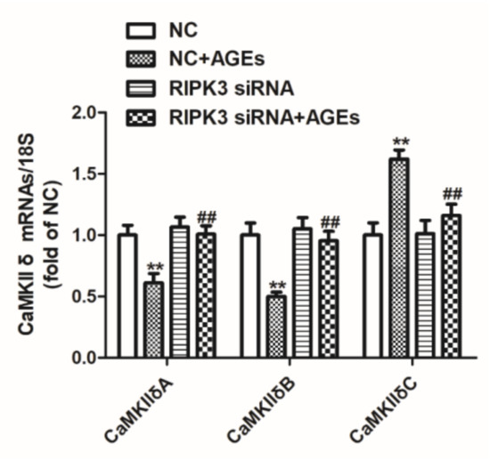 Down regulation of RIPK3 ameliorated the alternative splicing disorder of CaMKIIδ in cardiomyocytes. Cardiomyocytes were transfected with RIPK3 siRNA for 4 h followed by 200 μg/mL AGEs stimulation for 24 h. The mRNA expression of CaMKIIδA, CaMKIIδB, and CaMKIIδC was detected by quantitative real-time PCR in cardiomyocytes. 18S was used as a loading control. Plots represent the mean ± SEM; n = 6. Statistical significance: ** p < 0.01 compared with NC; ## p < 0.01 compared with NC+AGEs.