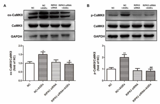 Downregulation of RIPK3 inhibited CaMKII activation in cardiomyocytes. Cardiomyocytes were transfected with RIPK3 siRNA for 4 h followed by 200 μg/mL AGEs stimulation for 24 h. (A) The expression of ox-CaMKII and CaMKII was detected by Western blot in cardiomyocytes. GAPDH was used as a loading control. (B) The expression of p-CaMKII and CaMKII was detected by Western blot in cardiomyocytes. GAPDH was used as a loading control. Plots represent the mean ± SEM; n = 6. Statistical significance: * p < 0.05, ** p < 0.01 compared with NC; # p < 0.05, ## p < 0.01 compared with NC+AGEs.