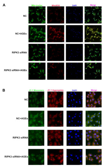 Down regulation of RIPK3 reduced oxidative stress in cardiomyocytes. Cardiomyocytes were transfected with RIPK3 siRNA for 4 h followed by 200 μg/mL AGEs stimulation for 24 h. (A) The generation of superoxide anion reactive oxygen species in mitochondria was detected by MitoSOX (Red) staining. Mito-Tracker (Green) co-localized mitochondria. The nuclei were stained by DAPI (Blue). Bar = 25 μm. (B) Mitochondrial membrane potential was detected by JC-1staining. When it is high, JC-1 aggregates in the matrix (Red). When it is low, JC-1 is mainly monomers (Green). The nuclei were stained by DAPI (Blue). Bar = 25 μm.