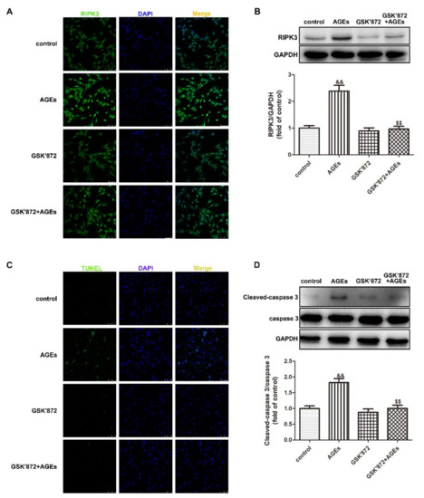 GSK′872 pretreatment inhibited necroptosis in cardiomyocytes. Cardiomyocytes were pretreated with 10 μM GSK′872 for 4 h followed by 200 μg/mL AGEs stimulation for 24 h. (A) RIPK3 was immunofluorescence stained by Alexa Fluor 488 (Green)-conjugated IgG. The nuclei were stained by DAPI (Blue). Bar = 75 μm. (B) The expression of RIPK3was detected by Western blot in cardiomyocytes. GAPDH was used as a loading control. (C) The apoptosis of cardiomyocytes was detected by One Step TUNEL Apoptosis Assay Kit. Bar = 75 μm. (D) The expression of caspase 3 and Cleaved-caspase 3 was detected by Western blot in cardiomyocytes. GAPDH was used as a loading control. Plots represent the mean ± SEM; n = 6. Statistical significance: && p < 0.01 compared with control; $$ p < 0.01 compared with AGEs.