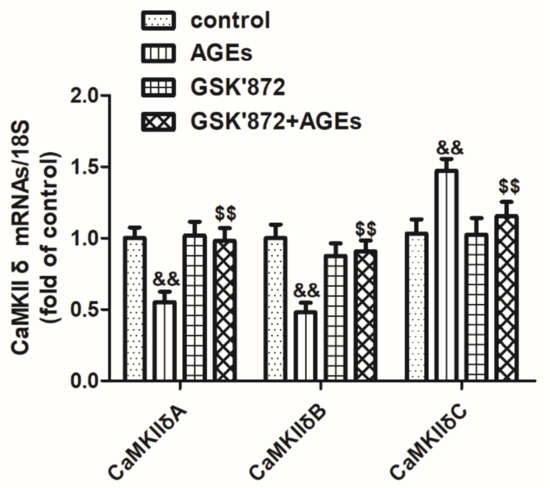 GSK′872 pretreatment ameliorated the alternative splicing disorder of CaMKII δ in cardiomyocytes. Cardiomyocytes were pretreated with 10 μM GSK′872 for 4 h followed by 200 μg/mL AGEs stimulation for 24 h. The mRNA expression of CaMKII δA, CaMKII δB, and CaMKII δC was detected by quantitative real-time PCR in cardiomyocytes. 18S was used as a loading control. Plots represent the mean ± SEM; n = 6. Statistical significance: && p < 0.01 compared with control; $$ p < 0.01 compared with AGEs.