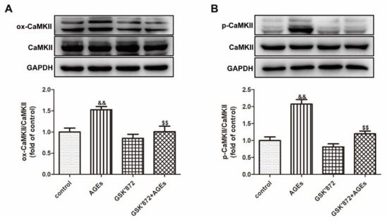 GSK′872 pretreatment inhibited CaMKII activation in cardiomyocytes. Cardiomyocytes were pretreated with 10 μM GSK′872 for 4 h followed by 200 μg/mL AGEs stimulation for 24 h. (A) The expression of ox-CaMKII and CaMKII was detected by Western blot in cardiomyocytes. GAPDH was used as a loading control. (B) The expression of p-CaMKII and CaMKII was detected by Western blot in cardiomyocytes. GAPDH was used as a loading control. Plots represent the mean ± SEM; n = 6. Statistical significance: && p < 0.01 compared with control; $$ p < 0.01 compared with AGEs.