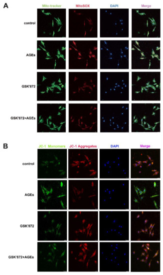 Cardiomyocytes were pretreated with 10 μM GSK′872 for 4 h followed by 200 μg/mL AGEs stimulation for 24 h. MitoSOX and JC-1 staining showed that GSK′872 pretreatment decreased the production of mitochondrial ROS (Figure 14A), improved the mitochondrial membrane potential (Figure 14B), suggesting that the GSK′872 pretreatment reduced oxidative stress induced by AGEs.