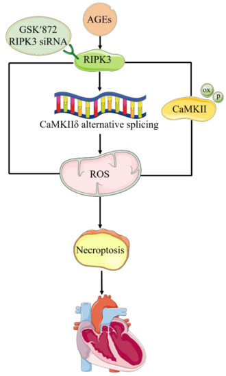 In conclusion, AGEs increased the expression of RIPK3, aggravated the disorder of CaMKII δ alternative splicing, promoted CaMKII activation, enhanced oxidative stress, induced necroptosis, and damaged cardiomyocytes. RIPK3 downregulation or RIPK3 inhibitor GSK′872 corrected CaMKII δ alternative splicing disorder, inhibited CaMKII activation, reduced oxidative stress, attenuated necroptosis, and improved cell damage in cardiomyocytes (Figure 15). The research suggests that RIPK3 may be an important target of diabetic myocardial damage, which provides a new idea for prevention and treatment of diabetic cardiomyopathy.