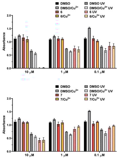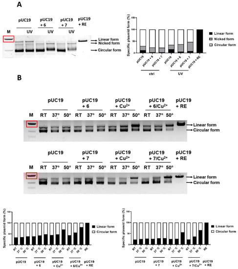 2.4.4. UV Exposure of Compounds 6 and 7 and/or Complexes with Cu Cation Induces Plasmid DNA Breaks