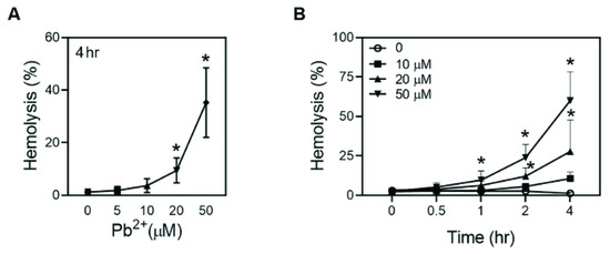 First, we examined the hemolytic responses of human erythroid cells exposed to different concentrations of Pb. Treatment with Pb for 4 h induced hemolysis in a concentration- and time-dependent manner as compared to that with a vehicle (Figure 1A,B). As shown in Figure 1B, with the increase of exposure time, the minimal toxic level of Pb was being lower. Here, no hemolysis (≤10%) was observed after Pb treatment with concentrations ≤20 μM at 1 h.