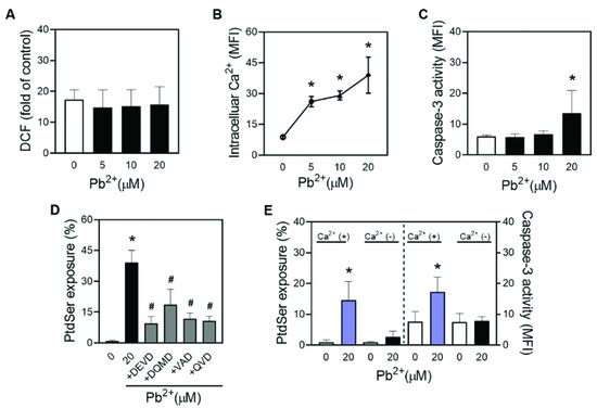 ROS-independent but [Ca2+]i-dependent eryptosis by Pb-treated erythroid cells. Isolated human erythroid cells were treated with various concentrations (0, 5, 10, and 20 μM) of Pb at 37 °C for 1 h. (A) DCF is a method to determine the content of intracellular reactive oxygen species by using flow cytometry. (B) Intracellular calcium level was examined by preloading 3 μM fluo-4 AM for 1 h. (C) Caspase 3 activity was measured as shown in the Materials and Methods section. (D,E) Inhibition of PtdSer exposure and caspase 3 activity was performed by preloading various caspase inhibitors or a calcium-chelating agent (TPEN) as shown in the Materials and Methods section. Values are the mean ± SD of 3–5 experiments. * Statistical difference compared with control (p < 0.05). # Statistical difference compared between groups (p < 0.05).