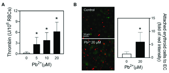Many studies have shown the procoagulant activity of exposed PtdSer in erythroid cells [31,32]. With prothrombinase assay as mentioned in the Materials and Methods section, procoagulant activity of human erythroid cells was shown by a concentration-dependent trend of thrombin generation after 1 h treatment with various concentrations of Pb at 37 °C (Figure 4A). In addition, fluorescence microscopy showed that Pb treatment could also enhance adherent erythroid cells to HUVECs (Figure 4B).