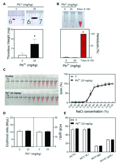 Lead (Pb) is one of the most abundant heavy metals on earth and a highly toxic pollutant. The sources of lead exposure in China include e-waste, drinking water, traditional drugs, and industrial emissions [1]. Pb exposure could affect multiple organs in the body including the kidneys, liver, and central nervous system. In addition, there is a lot of evidence that Pb exposure is associated with anemia [2] and cardiovascular disease [3,4]. Anemia is the most common issue caused by Pb exposure, and therefore, people often pay less attention to some more important health problems which might occur prior to anemia, such as thrombosis.