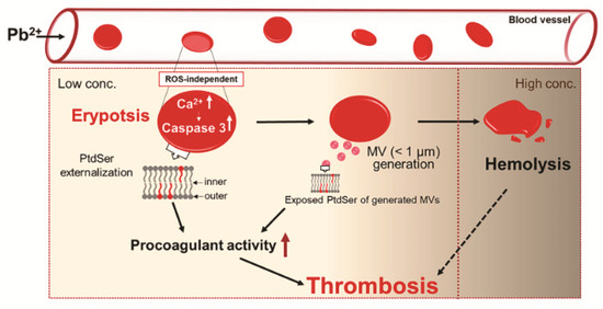 In our study, we demonstrated that Pb exposure may promote procoagulant activity of human erythroid cells and provoke thrombosis in mice prior to hemolysis in an ROS-independent but calcium-dependent eryptosis. Pb-induced procoagulant activity occurred at sub-hemolytic concentrations and thrombin generation, and adhered erythroid cells to endothelial cells were also facilitated. Here, ROS did not participate in regulating PtdSer externalization and MV generation. But interestingly, increased intracellular calcium levels can upregulate caspase 3 activity, both of which contributed to the disruption of phospholipid asymmetry and led to PtdSer externalization and MV generation, as well as shape changes into echinocytes and spherocytes. In parallel with in vitro results, in vivo relevance to thrombosis prior to hemolysis was well proven in a mice venous thrombosis model, supporting the prothrombotic risk of Pb prior to lysis.