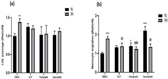 Using a transwell system, we showed that IH induced a significant increase in LDL passage (+37%, Figure 1a, bars: DMSO) and monocyte migration (+78%, Figure 1b, bars: DMSO) through an endothelial cell monolayer, compared to the situation under normoxia (N).