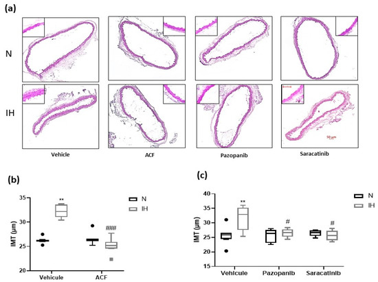 Surprisingly, we noticed that in animals exposed to normoxia (N), saracatinib significantly increased plasma sVE and arterial pressures and induced a trend towards atherosclerosis lesion increase (Figure 5b,e, p = 0.07) compared to the normoxic group treated with the inhibitor vehicle only. These effects of saracatinib were not found under IH, and may be explained by the fact that in N, src-kinases are not active and have a conformation different from that of the active enzyme assumed to be present during IH [46]. When Src-kinases are in their inactive form (in N conditions), saracatinib could not efficiently bind to the ATP binding site, as it does with the active form of the enzyme, and therefore loses its specificity for the enzyme. This could lead to cardiovascular side effects similar to those of multitarget tyrosine kinases inhibitors (as dasatinib, nilotinib, and sunitinib), including a high risk of hyperlipidemia [47,48,49]. To a lesser extent, pazopanib tends to have effects resembling those of saracatinib, but the difference does not reach the significance level except for arterial pressure, the increase of which is a known side effect of pazopanib [50]. Moreover, anti-VEGF therapy is considered as a risk factor of increased IMT and thus of atherosclerosis [51]. This can be explained by the lack of specificity of the VEGF receptor tyr-kinases inhibitor, pazopanib, for the inactive form, and by the fact that this molecule targets multiple tyrosine kinases [49]. However, we did not observe a thickening of the aorta wall under blockade of VEGFR-related pathways, i.e., under pazopanib or saracatinib treatment.