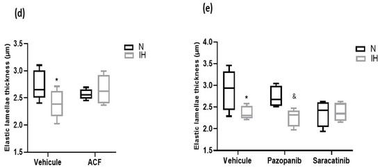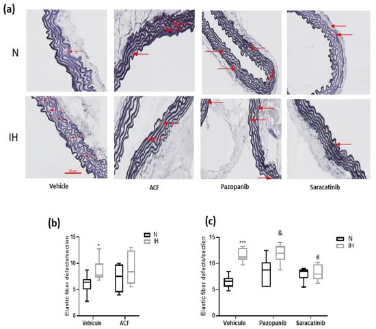 To assess the IH-induced vascular remodeling and effect of the inhibitors, we first measured the intima–media thickness (IMT) in aortas of C57BL/6J mice exposed for 14 days to IH or N, treated by DMSO alone (control), acriflavine, pazopanib or saracatinib. We reproduced the known IH-induced elevation of IMT [12] and showed that all the inhibitors prevented this effect (Figure 3a,c). Second, we confirmed that IH alters the aortic elastic lamellae, and the elastic fibers (Figure 4a) in particular, by increasing the number of elastic lamella disruptions (Figure 4b,c) and reducing the thickness of the elastic lamellae (Figure 4d,e) without affecting the number of elastic lamellae (Supplementary data S5). This effect was totally prevented by acriflavine and saracatinib, while pazopanib had no effect (Figure 4). As a complement, we verified that IH decreased the weight and increased the hematocrit of the studied mice, while these effects were unchanged by the inhibitors (Supplementary data S2).