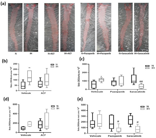 The impact of the inhibition of VE-cadherin cleavage pathways on atherosclerosis lesions in ApoE-/- mouse aortas. (a) Representative examples of ORO-stained entire aortas. (b) Inhibiting HIF-1 (by ACF) prevented atherosclerotic plaques in aortas of ApoE-/- mice exposed for 8 weeks to IH (Kruskal-Wallis test, ** p < 0.01 vs. N + vehicle, n = 5–8). (c) Inhibition of VEGFR tyr-kinases (by pazopanib) and src-kinases (by saracatinib) prevented the formation of atherosclerotic plaques in aortas of ApoE-/- mice exposed for 8 weeks to IH (Kruskal-Wallis test, * p < 0.05 vs. N + vehicle, ## p < 0.01 vs. IH + vehicle, n = 5–6). (d) Inhibiting HIF-1 (by ACF) tended to reduce atherosclerotic plaques in aortic roots of ApoE-/- mice exposed for 8 weeks to IH (Kruskal-Wallis test, p = 0.08 for N + vehicle vs. IH + vehicle, n = 4–8). (e) Inhibition of VEGFR tyr-kinases (by pazopanib) and src-kinases (by saracatinib) reduced the atherosclerotic plaque area in aortic roots of ApoE-/- mice exposed for 8 weeks to IH (Kruskal-Wallis test, # p < 0.05 vs. IH + vehicle, n = 5–6). N: normoxia, IH: intermittent hypoxia. Values are median + interquartile range.