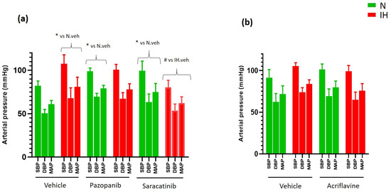 We measured arterial blood pressure by tail-cuff sphygmomanometry in ApoE-/- mice after 8 weeks of exposure to IH. We found that IH increased arterial systolic, diastolic and mean blood pressures, in accordance with the literature, and the VEGFR-tyrosine kinases and Src-tyrosine kinases inhibitors (pazopanib and saracatinib, respectively) prevented this effect (Figure 6a). In the groups intraperitoneously injected with drugs (DMSO or acriflavine), the hypertensive effect of IH did not reach the significance level and only trends were observed regarding the preventive effects of acriflavine (Figure 6b).