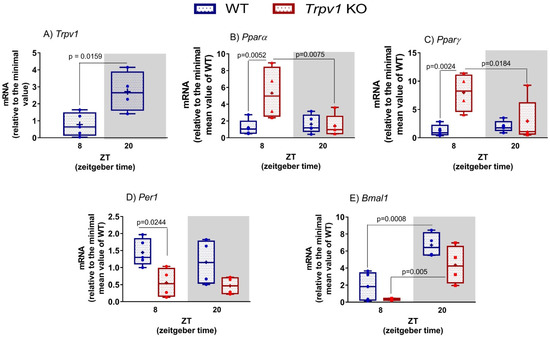 The log values were obtained from 5 animals, and the median, quantiles, and maximum and minimum expression values of gene transcripts normalized by 18S ribosomal RNA and expressed relative to the minimum mean value of WT mice. were plotted in graphs. Student’s t-test was used to compare Trpv1 gene expression between ZT 8 and ZT 20 in WT mice. To determine the differences between time points of the same genotype or among genotypes at the same time point, logarithmic data were compared by two-way ANOVA, followed by the Bonferroni post-test; p < 0.05 was established to reject the null hypothesis. All statistical analyses were carried out in Prism 7.0 (GraphPad 7.0, San Diego, CA, USA).