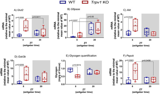 The maintenance of blood glucose homeostasis represents one of the fundamental challenges in the regulation of body metabolism, and circadian control has an important role in this scenario [37]. In this sense, it is known that glucose levels and tolerance and insulin action are known to vary throughout the day [24]. Considering that clock and PPAR genes are altered in the absence of TRPV1 channels, we decided to investigate how the TRPV1 channel participates in the regulation of hepatic glucose metabolism genes. One of the important functions of the liver is glucose homeostasis, and GLUT2 is the prevalent glucose transporter in this tissue [38]. We did not find temporal differences in the expression of Glut2 in the liver of WT mice, at least at the time points analyzed here. On the other hand, in the absence of TRPV1 channels, an increase in Glut2 expression was observed at ZT8 compared to WT mice. The increased expression of Glut2 in the light phase resulted in a daytime variation in its transcript (Figure 2A). In fact, the F test points out that genotype and the interaction between time and genotype are significant factors for Glut2 transcript regulation (Table 1).