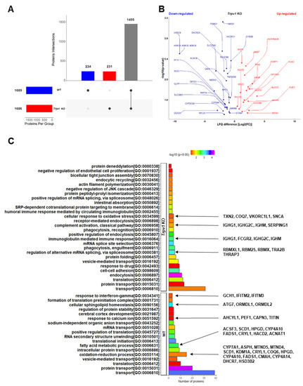 To assess in depth the hepatic functional dysregulation caused by the lack of TRPV1 channels, we next conducted a gene ontology biological process (GO-BP) enrichment analysis using exclusively identified proteins of each group. We found that 43 differential GO-BPs were evidenced in both groups (Figure 3C). The differential GO-BP of “regulation of alternative mRNA splicing, via spliceosome” in the liver of Trpv1 KO mice indicated enhanced RNA processing, which is in line with the downregulation of H2BC9, H2BC4, and H1-0 (core components of nucleosomes, Figure 3B). Proteins clustered in this enriched GO-BP may regulate a variety of post-transcriptional processes (e.g., alternative splicing, nucleocytoplasmic transport, translation, and degradation) under stress conditions and cellular reprogramming [51,52]. Of these, THRAP3 promotes the binding of CLOCK-BMAL1 to DNA and links it to the basic transcriptional machinery [53]; it is also required for the DNA damage response, control of mRNA splicing, and nuclear mRNA degradation [54]. In addition, we evidenced “cellular response to oxidative stress”, which might be intimately linked to DNA damage and inflammation, as demonstrated by the participation of TXN2 in previous studies [55,56]. In this context, the immune response mediated by immunoglobulin in Trpv1 KO mice seems to indicate inflammatory status [57,58], which is in line with reduced DHCR24 involved in the anti-inflammatory phenotype (Figure 3B).