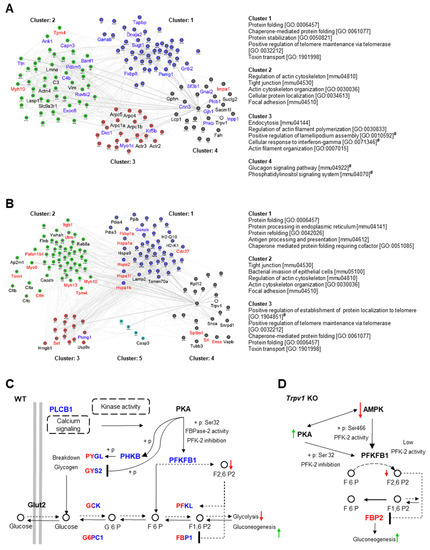 Network propagation highlights important liver clustering pathways and biological networks in the absence of TRPV1 channels. Network propagation of the TRPV1 channel in the liver of WT (A) and Trpv1 KO mice (B). TRPV1 protein input under each network served as a driver for network propagation in Trpv1 KO and WT. Separately propagated subnetworks with 141 proteins found to be significant in the propagation were clustered into smaller subnetworks and annotated using integrated enrichment analysis (GO-BP and KEGG pathway) to identify functional networks that are different between two propagated subnetworks (EnrichmentMap FDR < 0.01). Node names represent the proteins exclusively found in each propagated subnetwork; black for proteins shared between Trpv1 KO and WT proteomes; blue for proteins only found or upregulated in the WT proteome; red for proteins only found or upregulated in the Trpv1 KO proteome. Cluster title indicates the top five most significant biological function(s) for each cluster, and (#) refers to the KEGG pathway/GO-BP annotations exclusively enriched in each propagated subnetwork. (C) Framework of propagated network integration for enriched glucagon signaling pathway from KEGG in the WT proteome. (D) Framework shows proposed modulation of FBP-2 by PKA and AMPK kinases in Trpv1 KO mice resulting in more active gluconeogenesis than in WT mice. Blue nodes for proteins only found in the WT proteome, dual colors (blue/red) for proteins shared among proteomes, and black for proteins not found in the proteomic data. (+p) refers to phosphorylation and (−p) to dephosphorylation.