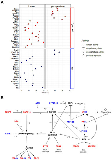 We investigated the participation of exclusively identified kinases and phosphatases in each proteome in the modulation of glycogenolysis/glycogenesis. Using gene ontology annotation from the Uniprot database, we mapped MAPK14, SGK2, and TRPM7 kinases and PGP, PPM1B, LHPP, and DUSP3 phosphatases in Trpv1 KO mice, while in the liver of WT mice, TTN, TWF1, CPNE3, CSNK2A1, MAPK1, TEK, ALPK3, PHKB, and ATM kinases and phosphatase PPP1CB were identified. We also examined proteins that improve or impair the kinase/phosphatase activity (Figure 5A). After that, we used the PhosphoSitePlus database (https://www.phosphosite.org/, accessed on 19 June 2022) with a setting to mouse, KEGG pathway annotation, and literature data to map the relationship between kinases/phosphatases and their upstream regulatory proteins and downstream targets and glycogenolysis/glycogenesis. Using these strategies, 11 proteins related to glycogenolysis/glycogenesis pathways were mapped (Table 2).
