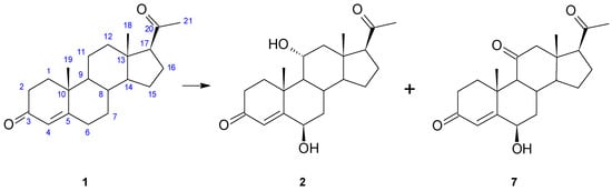 In our previous study regarding biotransformations by Isaria farinosa strains, progesterone was one of the model steroids [9]. In the culture of Isaria farinosa KCh KW1.1, progesterone was effectively transformed into only two products: 6β,11α-dihydroxyprogesterone (2) and 6β-hydroxy-11-oxoprogesterone (7) (Figure 1). The rapid and highly efficient process and one leading product (2; 75% yield after 24 h, established by GC) prompted us to conduct further research on this strain’s biotransformation of progesterone derivatives.