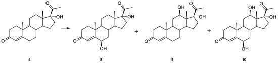 For a better understanding of the catalytic abilities of Isaria farinosa KCh KW1.1, another hydroxy derivative, 17α-hydroxyprogesterone (4), was used as a substrate. In this case, we isolated three hydroxy derivatives: 6β,17α-dihydroxyprogesterone (8), 12β,17α-dihydroxyprogesterone (9) and 6β,12β,17α-trihydroxyprogesterone (10) (Figure 3). All the compounds were determined based on their NMR data. In the 1H spectrum of 8, in contrast to the 17α-hydroxyprogesterone (4), a signal at δH = 4.44 ppm appears, which shows the appearance of a new hydroxyl group. Chemical shifts of characteristic methyl group signals (C-18, C-19 and C-21) and 4-H indicate that the isolated compound is 6β,17α-dihydroxyprogesterone (8). In addition, the structure of this compound confirms agreement with the literature data [23,24,25].