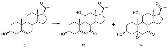 In contrast to 3-oxo-4-ene substrates (progesterone derivatives), we also tested pregnenolone (6), a C-21 steroid with a 3β-hydroxy-5-ene moiety. We isolated two compounds from the biotransformation medium with the Isaria farinosa KCh KW1.1 strain, 11α-hydroxy-7-oxopregnenolone (13) and 5α,6α-epoxy-3β,11α-dihydroxypregnan-7,20-dione (14) (Figure 5). Both products have a hydroxyl group at the 11α position, as progesterone derivatives have (excluding 17α-hydroxyprogesterone) a 7-oxo moiety. In our previous study, dehydroepiandrosterone, an analogous C-19, 3β-hydroxy-5-ene steroid, was hydroxylated only at the 7α and 7β positions [9]. With a very high probability, we can assume that the B-ring of pregnenolone (6) was first hydroxylated at C-7 (probably both α and β) and then underwent oxidation. The double bond of 11α-hydroxy-7-oxopregnenolone (13) was then epoxidated to give 5α,6α-epoxy-3β,11α-dihydroxypregnan-7,20-dione (14).