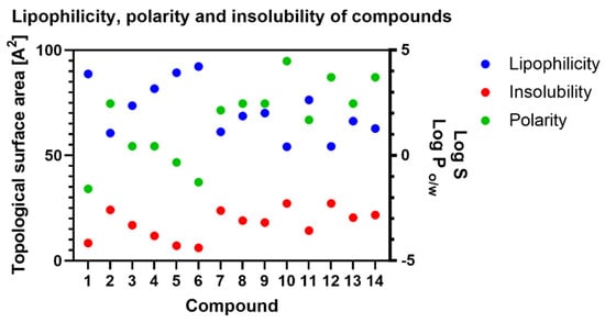 All values for lipophilicity, polarity and insolubility are gathered in Table 2, but for easier tracking of these correlations, we provide Figure 6.