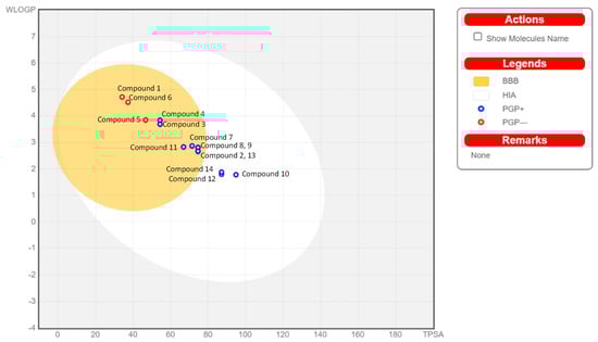 The SwissADME tool provides one more calculation called BOILED-Egg (Figure 7). This is a graphical result of simultaneous prediction of the passive gastrointestinal absorption (HIA) and brain access (BBB). The innermost part, the yolk, shows compounds with highly probable BBB permeation, and the middle part, the white, shows molecules with highly likely HIA absorption. Outside the egg is the grey part, which is responsible for compounds with predicted low absorption and limited brain penetration. The tool built this graph based on two parameters, log P and TPSA, for lipophilicity and apparent polarity, and it only models passive penetration through a gastro-intestinal wall and blood–brain barrier. Additionally, the model predicts that the tested compounds may be efficiently removed from these compartments by the P-glycoprotein. Analysing that graph, we can observe that most of the obtained compound is predicted to be removed by P-glycoprotein from the gastrointestinal tract and the central nervous system (Supplementary Materials).
