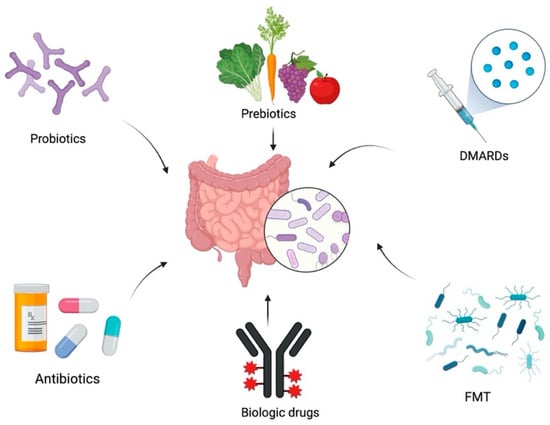 Therapeutic approaches that modify the intestinal microbiota. Created with BioRender.com. FMT: Faecal microbiota transplantation. DMARDs: Disease-modifying anti-rheumatic drugs.