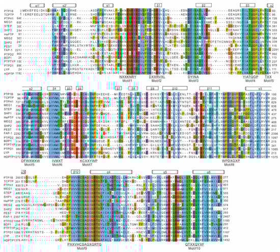 Sequence alignment of 17 human non-receptor PTPs catalytic domains. Sequences were obtained from Uniprot (https://www.uniprot.org/ (accessed on 7 August 2021)) database and aligned using EMBL-Clustal Omega (https://www.ebi.ac.uk/Tools/msa/clustalo (accessed on 8 August 2021)) database using default options. The alignment was further processed by Jalview (version 2.11.1.3) and colored with Clustal default option.
