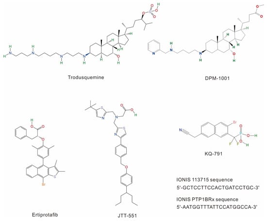 To date, only a few PTP1B inhibitors have been tested in clinical trials (Figure 3, Table 1), including ertiprotafib (a noncompetitive multiple-action inhibitor []), trodusquemine (a natural allosteric inhibitor [,]), JTT-551 (a mixed-type inhibitor [,]) and other more recently identified PTP1B inhibitors [,]. Unfortunately, most of them were discontinued due to their insufficient efficiency, lack of specificity and notable side effects [,].