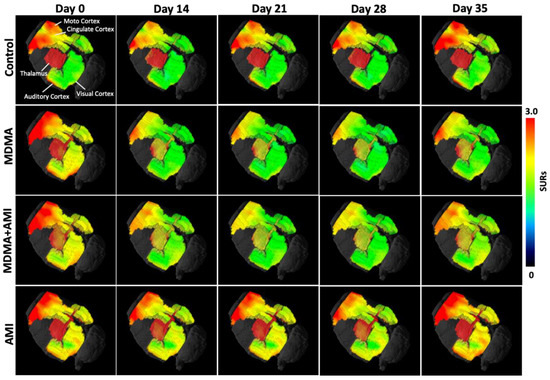 3D quantitative 4-[18F]-ADAM PET images in different brain areas. 4-[18F]-ADAM binding to SERT in the motor cortex, cingulate cortex, auditory cortex, visual cortex, and thalamus, striatum, hippocampus, and anterodorsal hippocampus. In general, the uptake of 4-[18F]-ADAM in all 9 regions was significantly reduced in MDMA group as compared to the controls and was gradually increased from day 14 to day 35 (second row). MDMA with AMI pretreatment demonstrated progressive and significant increase in the uptake of 4-[18F]-ADAM (third row) whereas AMI alone had no effect on the uptake of 4-[18F]-ADAM (fourth row).