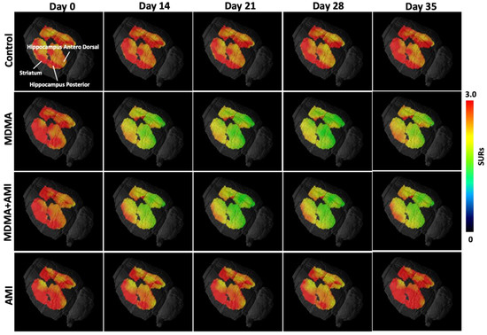 Our immunochemical findings (Supplementary Materials) confirmed the PET study, revealing that at day 28 post-MDMA, the density of serotonergic fibers and cell bodies decreased in the MDMA group. On the contrary, co-administration of MDMA with AMI showed improvement in structural damage of serotonin neurons. The results were consistent with several studies that reported dramatic decreases in SERT binding following various MDMA dosing regimens and post-administration [57]. This previous study also showed that the effect of MDMA on SERT depletion is region-specific. For example, areas such as the striatum and raphe nuclei seem to be affected more strongly than other areas such as the hypothalamus. In the long term, the evidence suggests that SERT gene expression is negatively regulated by MDMA exposure [58], leading to reductions in SERT binding and immunoreactive fiber density in the absence of physical damage.