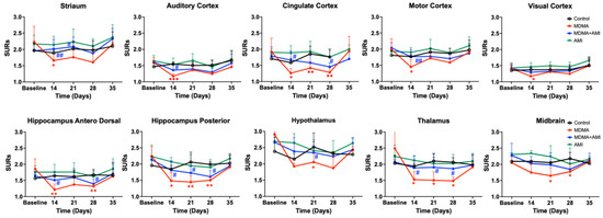 However, the uptake in the control groups was similar in each imaging data set (top row). In the baseline, the hypothalamus showed the highest 4-[18F]-ADAM uptake, followed by the midbrain, thalamus, striatum, hippocampus posterior, motor cortex, cingulate cortex, anterodorsal hippocampus, auditory cortex, and visual cortex (Figure 3 black line).