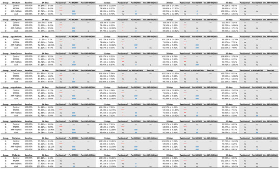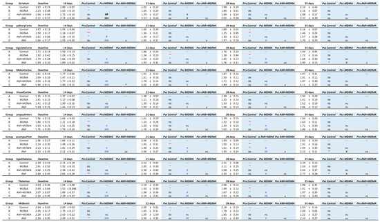 The group of AMI with MDMA (Figure 3 blue line) showed the neuroprotective effect from day 14, with statistical differences with the MDMA group (blue # p < 0.05~## p < 0.01 Group C-AMI+MDMA compared to Group B-MDMA). The AMI alone (Figure 3 green line) group showed a similar pattern with the control (Figure 3 black line). Detailed statistical results between groups are summarized in Figure 4.