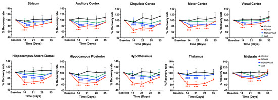 In all brain regions, co-administration of AMI with MDMA resulted in higher 4-[18F]-ADAM uptake compared to the MDMA group (Figure 2). At day 14, the recovery rates of seven of the ten regions were significantly different between the two groups (MDMA vs. AMI + MDMA, blue # p < 0.05~### p < 0.001, Figure 5 and Figure 6). AMI dramatically increased 4-[18F]-ADAM uptake in all brain regions (Figure 3 blue line), which enhanced the average ~18% recovery rate at day 14 when compared with the MDMA group (MDMA 71.29% ± 3.21% vs. MDMA + AMI 89.06% ± 3.38%; Figure 5 red vs. blue line). Thus, the effect of MDMA-induction or self-recovery rate varied in different regions. It seemed that AMI globally accelerated the SERT recovery rate from day 14 and then reached 96.23% ± 11.98% at day 35. Detailed results are summarized in Figure 4 and Figure 6.
