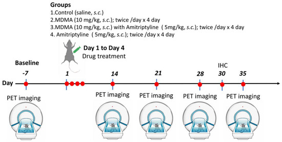 The experiment was conducted using 4-[18F]-ADAM PET imaging to measure SERT occupancy by MDMA and amitriptyline, as a method to gauge in vivo SERT binding of MDMA and AMI. Post-drug 4-[18F]-ADAM PET scans were performed weekly from day 14 to day 35 to measure SERT occupancy/recovery longitudinally. At day 28, three rats in each group were euthanized for immunohistochemistry; the remainder of the rats were subjected to 4-[18F]-ADAM PET imaging on day 35. The experimental design is schematically illustrated in Figure 7.