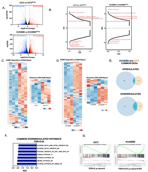 Transcriptomic alterations in IR-Surv cell populations. (A) Volcano plot showing the upregulated (red) and downregulated (blue) genes in IR-Surv U373 and KUGBM8 cells (Log2fold change > 1 and FDR < 0.05) (B) Gene Set Enrichment Analysis (GSEA) plots of U373 and KUGBM8 cells showing the distribution of all available gene sets. (C,D) Differential expression heat map of GOBP Regulation of DNA Repair and Reactome DNA DSB Repair gene sets for U373 and KUGBM8 cells. Heat map showing z-score of log2 transformed gene expression of selected genes. (E) Number of commonly and differentially upregulated (top) or downregulated (bottom) genes between U373 and KUGBM8 cells and their IR-Surv cell pairs. (F) Commonly downregulated gene sets between U373 and KUGBM8 cell pairs. (G) Representative enrichment plots of “Hallmark_Hypoxia” gene sets for U373 and KUGBM8 cells.