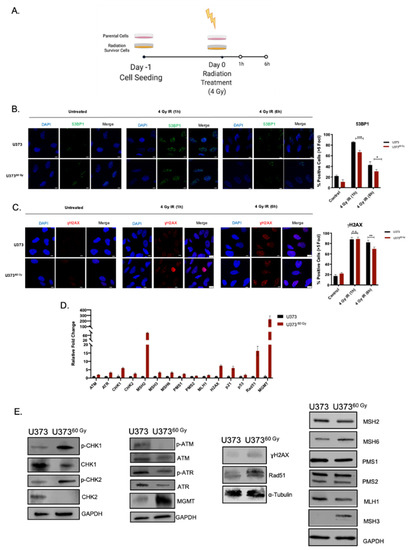 IR-Surv cells have higher DNA repair capacity. (A) Experimental setup for immunofluorescence staining for capturing DNA damage and repair (generated by Biorender.com). (B,C) Representative fluorescent images of labelled 53BP1 and γH2AX foci after 1 and 6 h of 4 Gy IR exposure of U373 and U37360 Gy (Scale bar: 10 μm) (Blue: DAPI, Green: 53BP1, Red: γH2AX). (D) qRT-PCR results showing expression levels of different DNA damage response and repair elements. (E) Changes in protein levels of DNA damage response and repair elements. (ns denote not significant, for p-values, *, **, *** denote p < 0.05, p < 0.01, p < 0.001, respectively, two-way ANOVA).