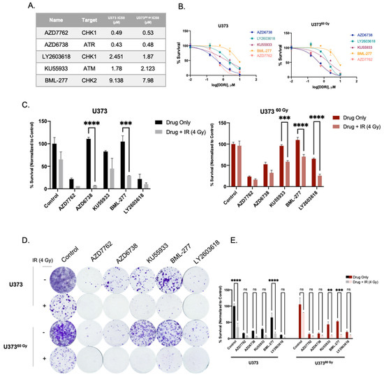 DNA damage response and repair pathways are among the most targeted pathways for therapeutic purposes in cancer. Inhibition of central regulators of DDR, such as Atm, Atr, Chk1, and Chk2 is considered a prime therapeutic approach in chemo- or radiosensitization studies [37,38,39]. Based on our observations with IR-Surv cells, which activated DDR to adapt to long-term IR, we interrogated whether their inhibition would sensitize IR-Surv cells to irradiation. We selected five DDR-related kinase inhibitors (DDRi) (AZD7762, AZD6738, KU55933, BML-277, and LY2603618) targeting Atm, Atr, Chk1, or Chk2 (Figure 5A). U373 and U37360 Gy both responded to DDRi in a dose-dependent manner (Figure 5A,B). Further, 1 µM DDRi radiosensitized both U373 and U37360 Gy cells, but the degrees of sensitization were different between them, when examined with short-term (7 day) viability assays (Figure 5C). In addition, we tested the effect of 1 µM DDRi and IR combination treatment on a long-term (14-day long) clonogenic assay. Accordingly, U37360 Gy cells were slightly less responsive to KU55933 (Atm inhibitor) individual treatment, consistent with our initial findings. Combination treatment of DDRi and single-dose 4 Gy IR were very effective on both U373 and U37360 Gy cells (Figure 3D,E). These results suggest IR-Surv cells with increased DNA damage response activity can be sensitized to IR treatment using DDR inhibitors.