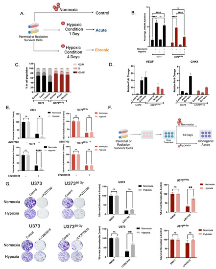 As hypoxia was identified as the top downregulated pathway from our transcriptomic analysis, we investigated the behavior of IR-Surv cells by exposing them to hypoxic conditions. For this, we examined three conditions, control (normoxia), acute hypoxia (applied for 1 day) and chronic hypoxia (applied for 4 days) (Figure 6A). As a mimic for irradiation, we used DSB-causing drug Bleomycin [40] and investigated the activation of H2AX under normoxic and hypoxic conditions upon 2 h of Bleomycin treatment. Accordingly, under normoxic conditions, Bleomycin increased γH2AX activation in both U373 and U37360 Gy cells significantly. The γH2AX activation levels were similar under hypoxia in U373 cells. However, U37360 Gy cells exhibited slightly less γH2AX activation under hypoxic conditions, suggesting a different mode of adaptation to DNA damage and repair (Figure 6B). These adaptations have possibly affected cell cycle progression. Chronic hypoxia did not alter cell cycle distribution of U37360 Gy, only affecting U373 cells through G2/M arrest (Figure 6C). Downregulated response to hypoxia was also observed at gene expression level. Upon hypoxia, the extent of vascular endothelial growth factor (VEGF) upregulation, which can be considered a biomarker for hypoxia [41], was not the same in IR-Surv cells compared to parental cells. Specifically, upon hypoxia treatment, the VEGF induction was more than 20-fold in U373 parental cells, but it was less than 10-fold in U37360 Gy IR-Surv cells. In addition, CHK1 upregulation in U37360 Gy cells was not observed to the same extent as in parental U373 cells (Figure 6D). To test whether the cells’ response to DDRi would be altered under hypoxic conditions, we treated U373 and U37360 Gy with low-dose (200 nM) Chk1 inhibitors, AZD7762 and LY2603618. To highlight their effects on cell viability, we applied 200 nM of both AZD7762 and LY603618 under normoxic and hypoxic conditions to both U373 and U37360 Gy cells. While 4 days of Chk1i treatment was very effective on U373 cells, it became more effective under hypoxic conditions. However, similar cell viability was observed for U37360 Gy cells under both normoxic and hypoxic conditions (Figure 6E). To test whether this phenotype is temporary or exclusive to short-term hypoxia, we performed a 14-day clonogenic assay in hypoxic conditions (Figure 6F). After Chk1i treatment, cells were incubated in a hypoxic incubator for 14 days. Clonogenic assay results revealed that U37360 Gy cells were far less sensitive to Chk1i-hypoxia combination treatment than U373 cells (Figure 6G). Thus, IR-Surv cells exhibit resistance to Chk1 inhibition, and the sensitization can be achieved through IR combination, but not to sufficient degrees in hypoxic conditions.